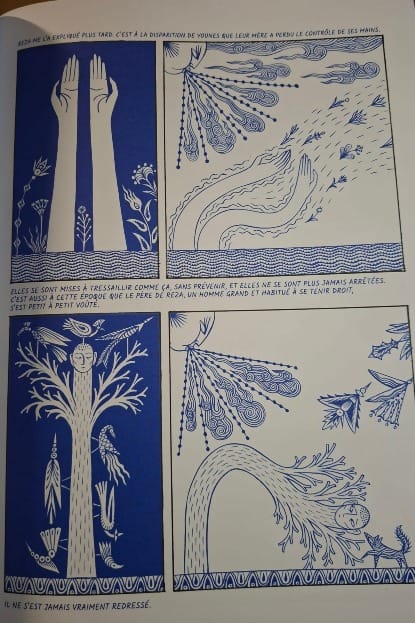 Dans les dessins de Damezin, on ressent la vivacité, l’agilité, la manière qu’a l’humain de s’adapter aux situations les plus étranges. Les personnages flottent, roulent sur la page ; on est emporté, on vole, on vacille. On s’émerveille devant le géant, on se brise devant la tristesse si finement dessinée. Les regards restent neutres juste assez longtemps… jusqu’à la nouvelle qui vient plaquer la douleur sur les visages. Et d’un seul regard, toute une planche se renverse.